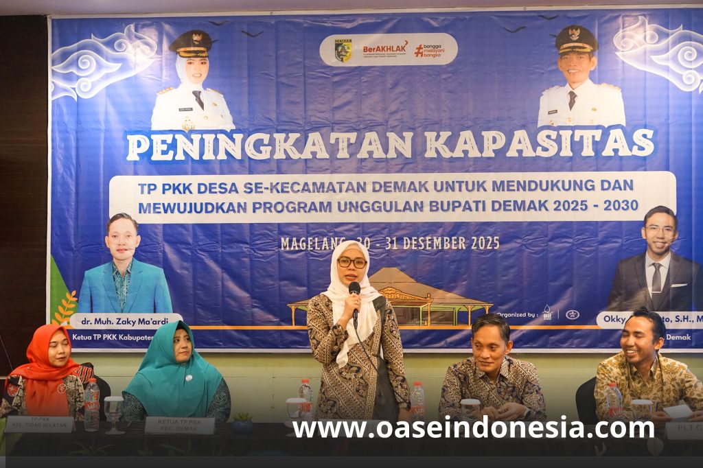 Magelang – Kegiatan Peningkatan Sumberdaya Manusia Aparatur Pemerintah Desa Se-Kecamatan Demak yang dilaksanakan pada 30–31 Desember 2025 di Magelang menjadi momentum penguatan kapasitas tata kelola desa dan pemberdayaan masyarakat. Bertempat di Atria Hotel Magelang, agenda hari pertama dibagi dalam dua ruang, yakni Pemerintah Desa dan TP PKK, dengan pembahasan strategis seputar sinergi pembangunan, evaluasi program 2025, perencanaan dan sistem keuangan desa 2026, serta penguatan peran PKK yang selaras dengan program unggulan Bupati. Diskusi berlangsung dinamis dengan partisipasi aktif seluruh peserta yang menunjukkan antusiasme tinggi dalam menyelaraskan program kerja. Kehadiran Bupati Demak dan Ketua TP PKK Kabupaten Demak menegaskan komitmen bersama dalam mewujudkan desa yang semakin maju dan bermartabat sekaligus memperkuat kolaborasi lintas sektor di tingkat kecamatan.